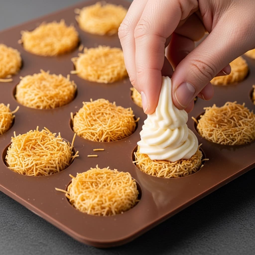 The crunchy layer is typically made from kataifi pastry, a thin shredded dough used in Middle Eastern desserts like kunafa.